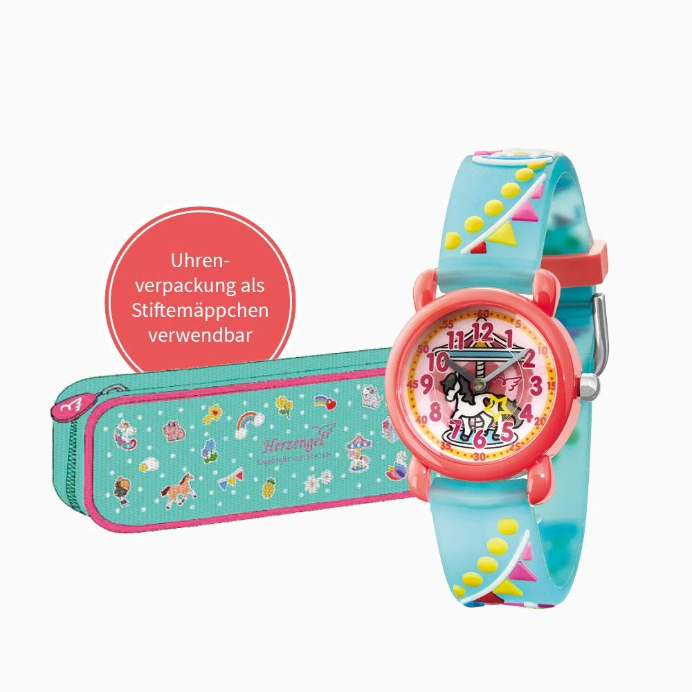 Herzengel´s Rummelplatz – diese zauberhafte Armbanduhr, mit einem bunten Karussell, lässt Mädchenherzen höherschlagen. Eine Karussellfahrt bringt Spaß und Freude. Die Uhr überzeugt durch ihre leuchtenden bunten Farben, einem robusten Gehäuse aus hochwertigem Kunststoff und einem weichem Kunststoffarmband, welches sich dem Kinderarm angenehm anpasst. Das Band kann individuell zwischen 13,5 cm und 17 cm Umfang eingestellt werden. Herzengel Uhren haben ein gut lesbares Ziffernblatt mit Stundenzahlen und Minutenstrichen. Ein gut erkennbarer Stunden und Minuten Zeiger erleichtert Kindern das Ablesen der Uhrzeit. Als Highlight hat der Sekundenzeiger ein süßes Motiv, das sich im Sekundentakt bewegt.