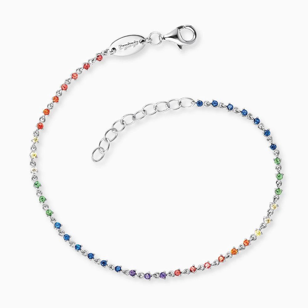 Keep it so simple: Pure Eleganz, wunderschöne Weiblichkeit und strahlende Jugend – alles in Einem verleiht dieses wunderschöne filigrane Armband Little Moon. Ein besonderes Highlight sind die edel schimmernden synthetischen Zirkonia Steine in Multicolor. Das farbenfrohe Wunder strahlt wie ein Regenbogen umgeben von klassischem Silber. Kombiniert mit mehreren Armbändern oder einer Uhr entsteht ein toller Layering-Effekt, der als Duo, Trio oder Quartett eine wunderschöne Symphonie ergibt. Das Armband kann in beliebigen Größen zwischen 17 cm und 20 cm Umfang eingestellt und mit einem Karabinerhaken verschlossen werden.