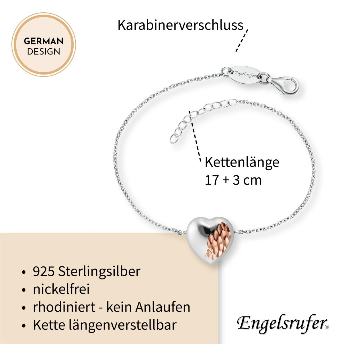 Engelsrufer verwendet für seine Schmuckstücke die hochwertigste Legierung 925er Sterlingsilber. Das auf dem Silber als weitere Veredelung verwendete Rhodium dient dem angenehmen Tragekomfort und schützt es vor dem Anlaufen. Alle Schmuckstücke sind nickelfrei und somit auch für Allergiker hervorragend geeignet.