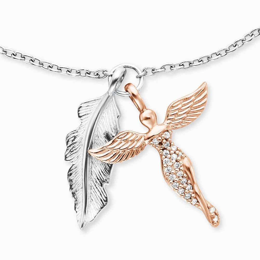 Unbeschwert und leicht zieren Feder und Schutzengel mit ihrer filigranen Schönheit das Armband. Feder und Engel bilden zusammen ein bicolores Duett, voller Harmonie und Stärke. Ein besonderes Highlight sind die edel schimmernden synthetischen Zirkonia Steine des Engels. Denn was könnte femininer sein als strahlend schöne Kristalle umgeben von klassischem Silber und zartem Rosé. Das Armband kann in beliebigen Größen zwischen 17 cm und 20 cm Umfang eingestellt und mit einem Karabinerhaken verschlossen werden.