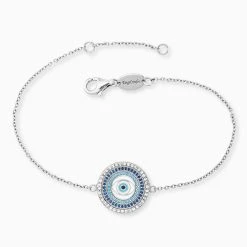 Das Auge ist das Fenster zur Seele. Dieses filigrane Engelsrufer Armband, mit dem schützenden Auge, begleitet Dich auf all Deinen Wegen. Unser Highlight ist das Armband mit weißen, hell- und dunkelblauen Zirkonia Steinen, die das schützende Auge bilden und Dich die Welt mit Wahrheit und Weisheit sehen lassen – strahlend schöne Kristalle, umgeben von klassischem Silber. Es unterstreicht Deine natürliche Schönheit und Weiblichkeit. Das wunderschöne Schmuckstück wird mit einem Karabinerhaken verschlossen und ist in zwei Längen verstellbar.