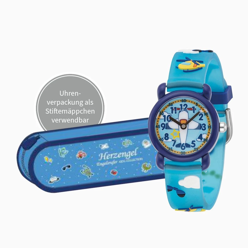 Herzengel´s Pilot – allezeit bereit zu einer kleinen Flugreise in die Fantasie. Diese farbenfrohe Armbanduhr mit vielen Motiven rund um das Thema Fliegen lässt Jungenherzen höherschlagen. Die Uhr überzeugt durch ihre schöne Farbgestaltung, einem robusten Gehäuse aus hochwertigem Kunststoff und einem weichem Kunststoffarmband, welches sich dem Kinderarm angenehm anpasst. Das Band kann individuell zwischen 13,5 cm und 17 cm Umfang eingestellt werden. Herzengel Uhren haben ein gut lesbares Ziffernblatt mit Stundenzahlen und Minutenstrichen. Gut erkennbare Stunden und Minuten Zeiger erleichtern Kindern das Ablesen der Uhrzeit. Als Highlight hat der Sekundenzeiger ein schönes Motiv, das sich im Sekundentakt bewegt.