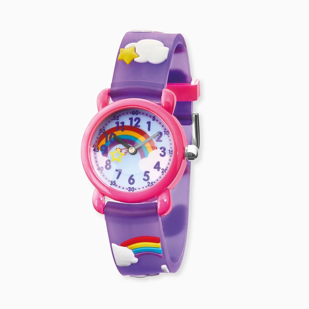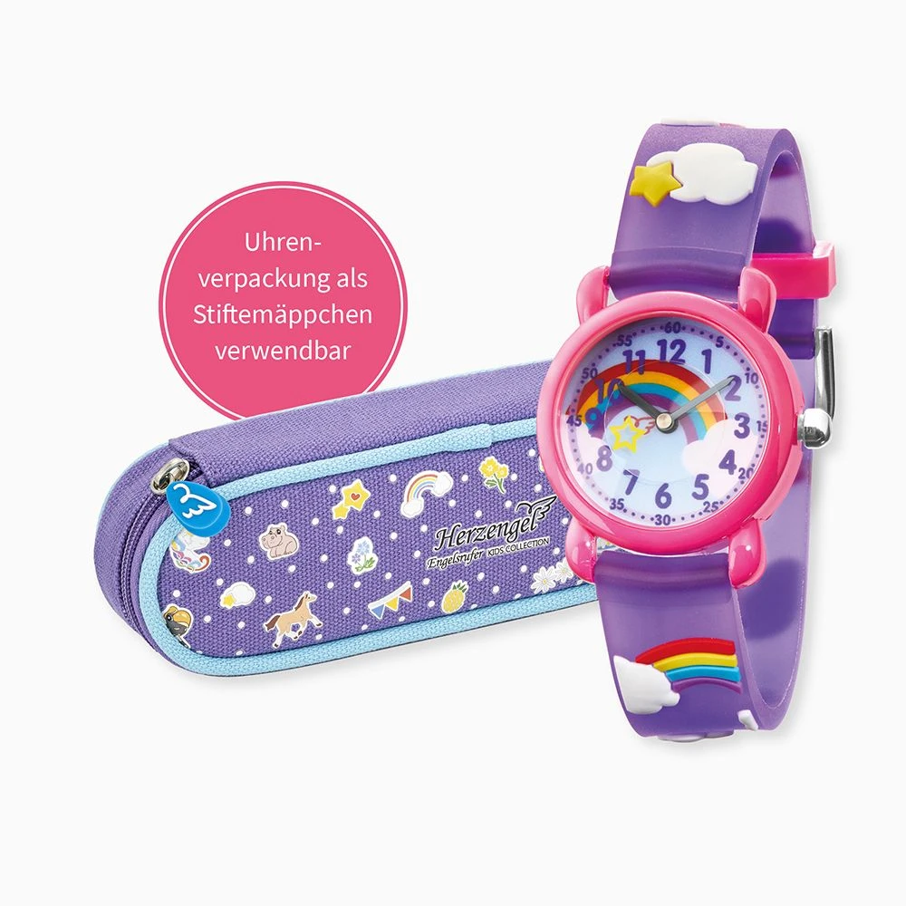 Herzengel’s Regenbogen Träume – diese zauberhafte Armbanduhr mit dem Symbol eines bunten Regenbogens, lässt Mädchenherzen höherschlagen. Der Regenbogen strahlt fröhlich und schenkt schöne Momente. Die Uhr überzeugt durch ihre leuchtenden bunten Farben, einem robusten Gehäuse aus hochwertigem Kunststoff und einem weichem Kunststoffarmband, welches sich dem Kinderarm angenehm anpasst. Das Band kann individuell zwischen 13,5 cm und 17 cm Umfang eingestellt werden. Herzengel Uhren haben ein gut lesbares Ziffernblatt mit Stundenzahlen und Minutenstrichen. Ein gut erkennbarer Stunden und Minuten Zeiger erleichtert Kindern das Ablesen der Uhrzeit. Als Highlight hat der Sekundenzeiger ein süßes Motiv, dass sich im Sekundentakt bewegt.