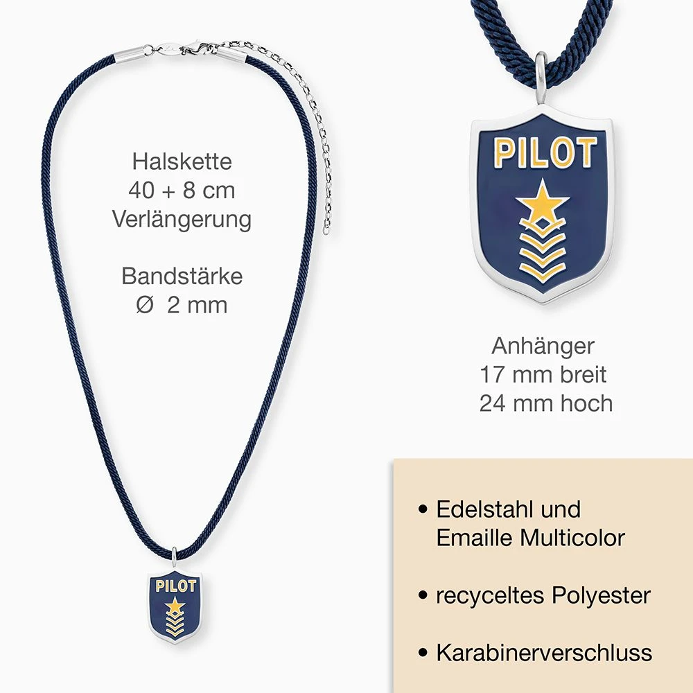 Herzengel´s Pilot – diese Kette mit Pilot Symbol lässt Jungenherzen höher schlagen und überzeugt durch die leuchtenden multicolor Farben und Details aus Emaille. Ein himmlisches Vergnügen – mit unserem Piloten startest Du zu Deiner Flugreise. Das zeitlose Schmuckstück wird mit einem Karabinerhaken verschlossen. Die Kette kann individuell zwischen 40 cm und 48 cm eingestellt werden. Für dieses Schmuckstück verwendet Engelsrufer hochwertigen Edelstahl, nickelfrei und ist somit auch für Allergiker hervorragend geeignet. Unsere Bänder sind aus recycelten Polyester, dadurch nutzen wir bereits existierendes Material.