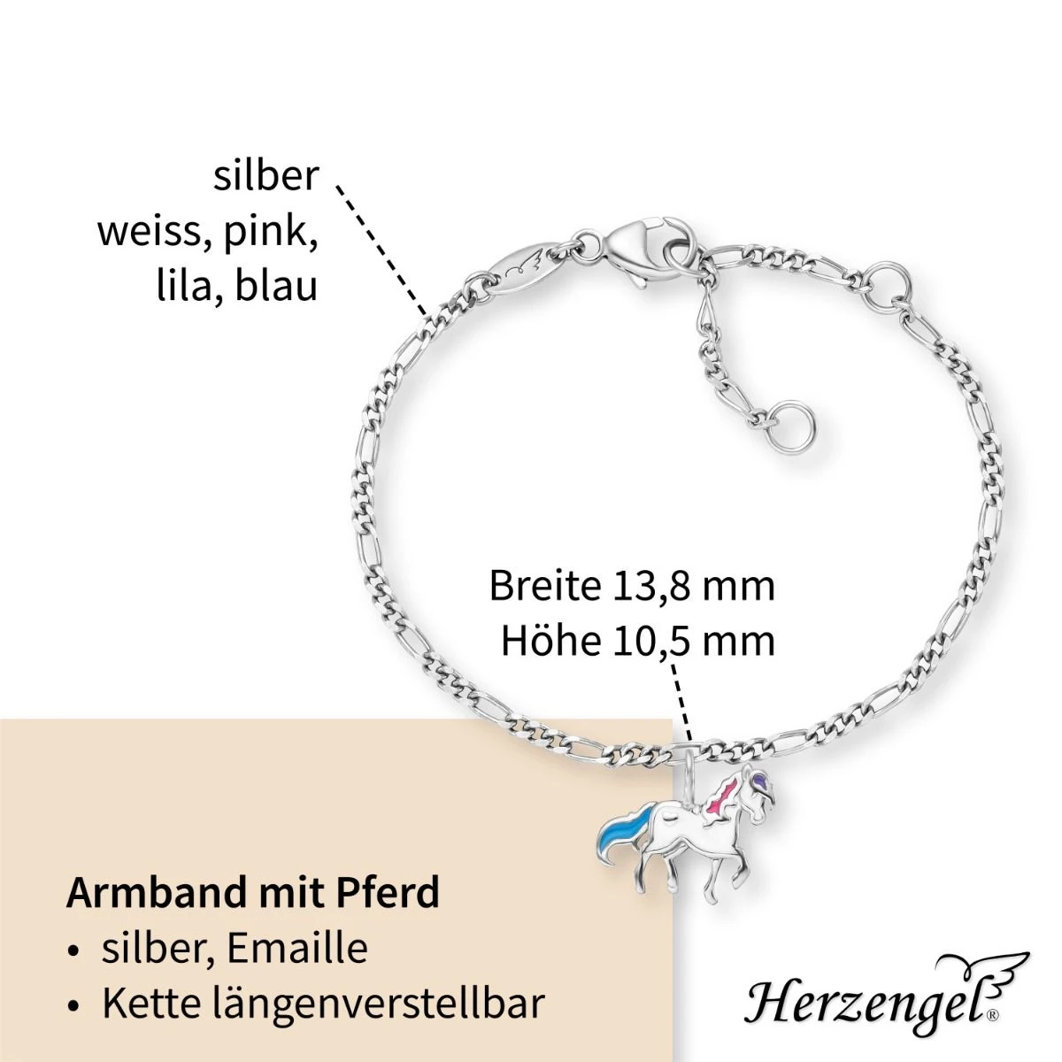 Herzengel´s Ponyhof – dieses zuckersüße Armband mit einem bunten Pony als Anhänger lässt Mädchenherzen höherschlagen. Das kleine Pony bringt Energie und Leidenschaft. Das Armband überzeugt durch die bunten Details aus Emaille und schmiegt sich optimal um die schmalen Handgelenke unserer Kleinen. Das wunderschöne Schmuckstück wird mit einem Karabinerhaken verschlossen und ist in drei Längen verstellbar.