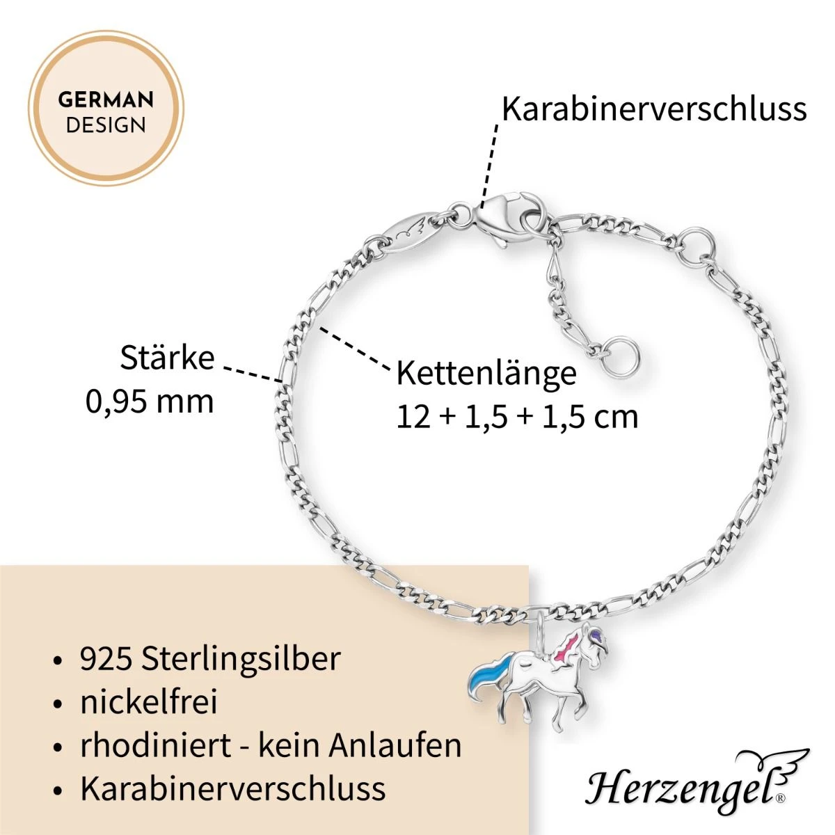 Herzengel verwendet für seine Schmuckstücke die hochwertigste Legierung 925er Sterlingsilber. Das als weitere Veredelung verwendete Rhodium dient dem angenehmen Tragekomfort und schützt das Schmuckstück vor dem Anlaufen. Alle Schmuckstücke sind nickelfrei und somit auch für Allergiker hervorragend geeignet.