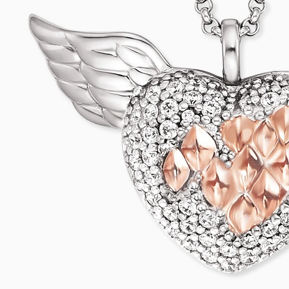 Flying heart – für einen besonderen Menschen wie gemacht. Diese Kette mit beflügeltem Herz Anhänger erstrahlt im reinen Glanze durch die Kraft einzelner Zirkonia Steinchen. Ein weiteres Highlight der Kette bilden die roséfarbenen Vertiefungen im Korpus des Herzens, welche den Weg zum Herzen auf symbolischer Weise ebnen. Sie stehen für das Feuer der Liebe. Das zeitlose Schmuckstück wird mit einem Karabinerhaken verschlossen und ist in drei Längen verstellbar.